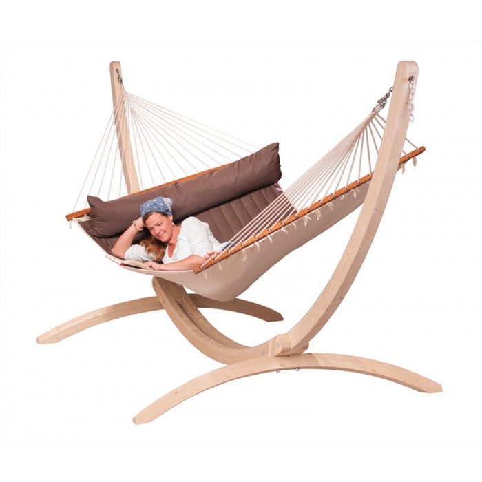 Hammock Kingsize with bars La Siesta Alabama Arabica provides generous relaxation in North American style. An integrated pillow and a padded lying surface (filling: polyester) make this hammockwith spreader barsso exceptionally comfortable.