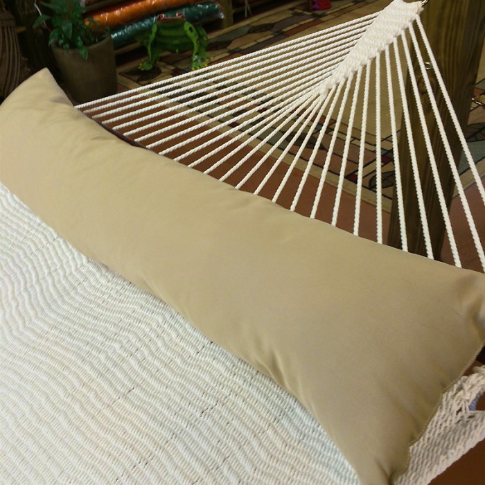 This pillow for hammock (Antique Beige) is made from olefin polyester, with polyester-fill, to with-stand the elements. Equipped with three straps to tie it onto the spreader bar of the hammock. At close to 55 inches wide, it cover the hammock one side to the other and is comfortably size for use by two adults. With over 9 coordinate colors to choose from, it is a perfect accessory for any hammock.