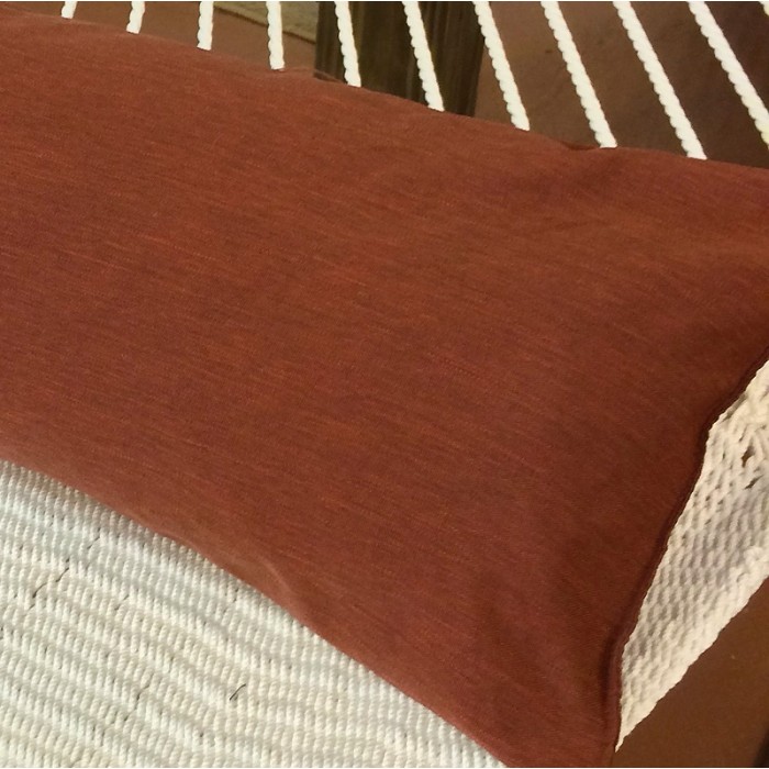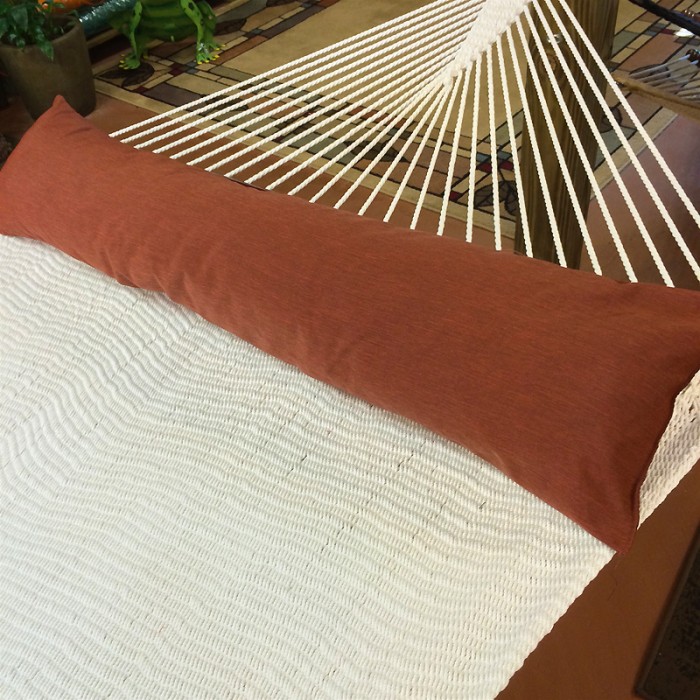 This pillow for hammock (Terracotta) is made from olefin polyester, with polyester-fill, to with-stand the elements. Equipped with three straps to tie it onto the spreader bar of the hammock. At close to 55 inches wide, it cover the hammock one side to the other and is comfortably size for use by two adults. With over 9 coordinate colors to choose from, it is a perfect accessory for any hammock.