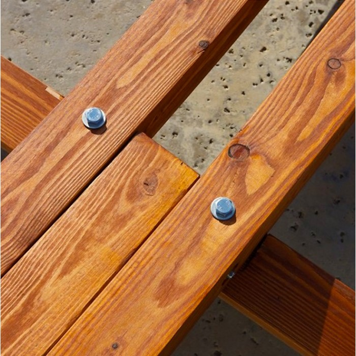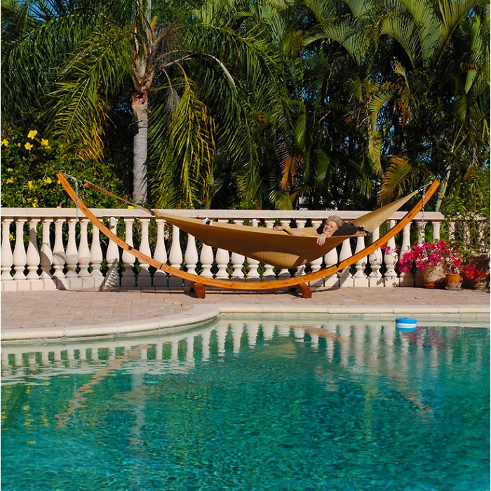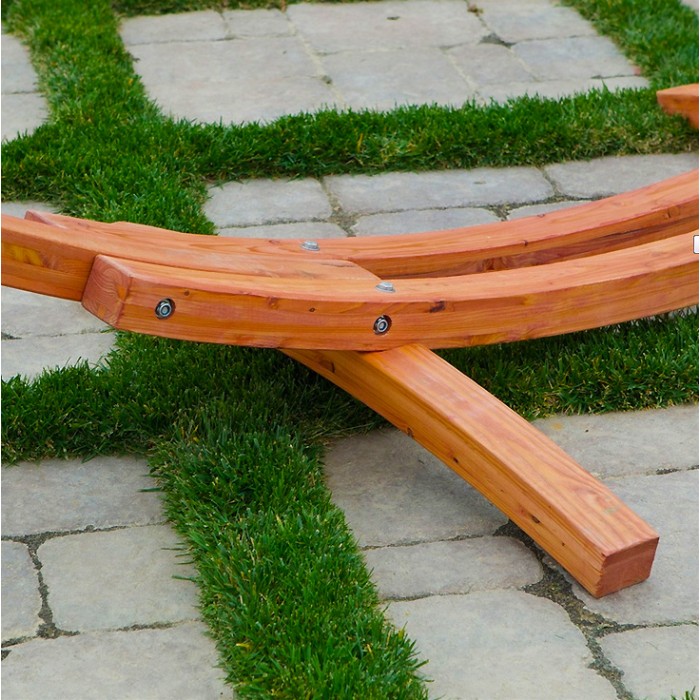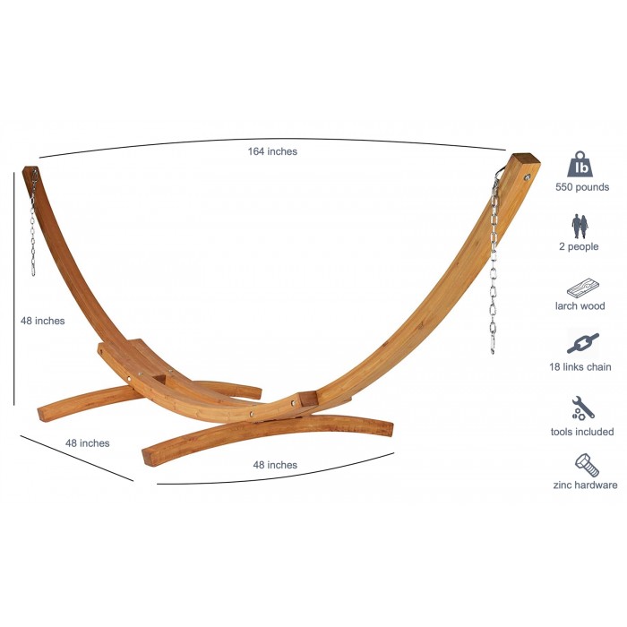 This Hammock Stand is crafted from multiple layers of FCS certified Australian Eucalyptus wood. Each layer is hand bent and radio frequency glued to form thicker heavier beams that are characteristically arc shaped. Meticulous sanding is followed by coats of marine varnish to achieve a stylish high gloss finish. All the hardware is Stainless Steel arranged into a triple screw design for extra strength and stability. This hammock stand is 14 ft long and designed to work in conjunction with the Jumbo Caribbean Hammocks.